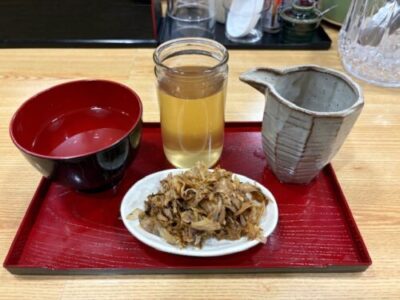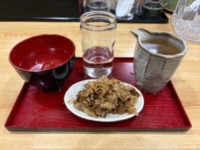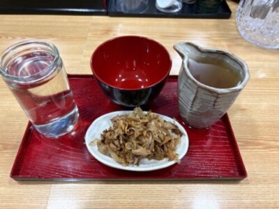 日本酒をうどんのお出汁で割って頂くというものですが、おつまみとして出汁ガラ煮がついてきます! 😳
