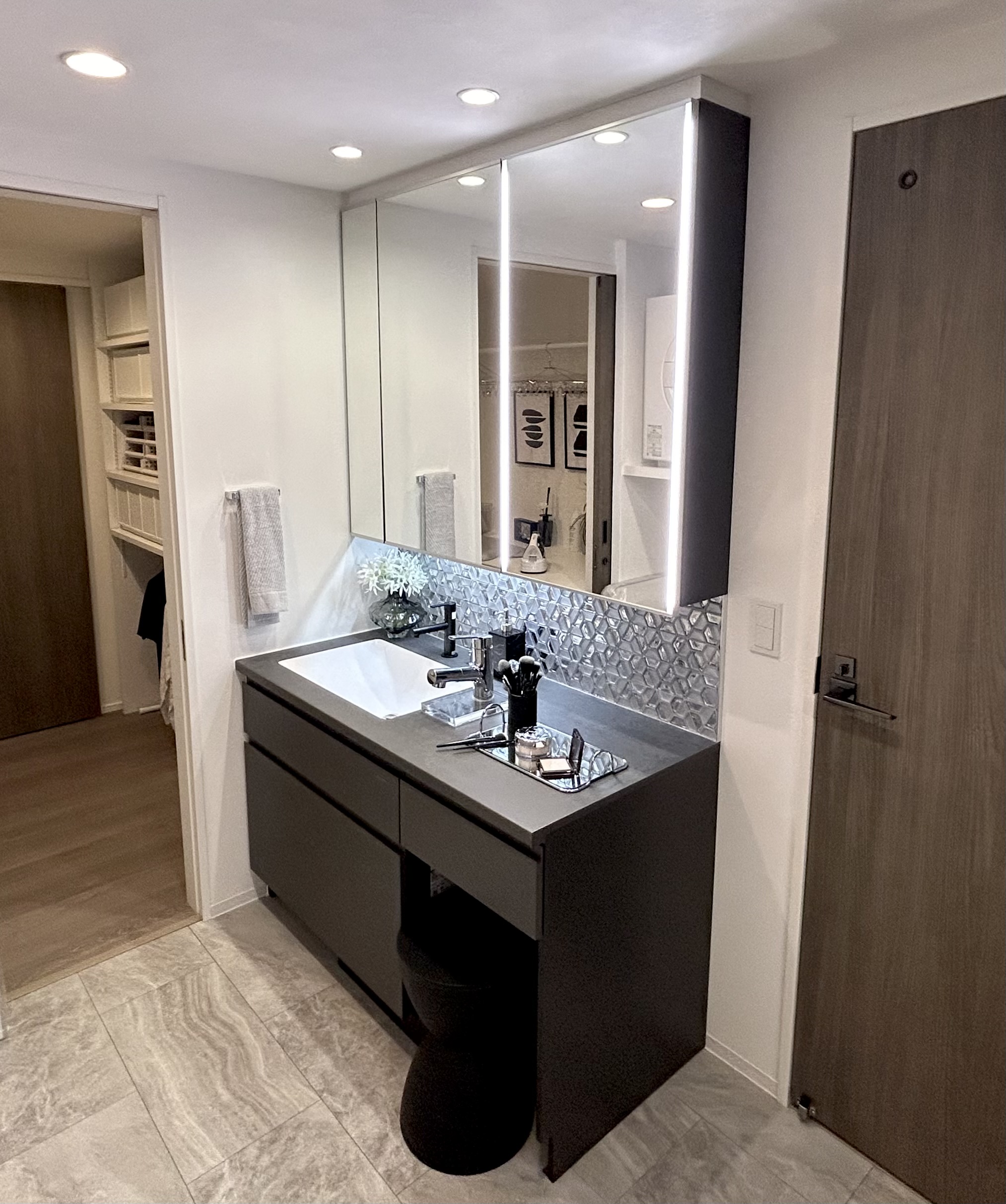 黒を基調にしたスタイリッシュな洗面台で、メイクがしやすい照明と鏡の大きさが本当に最高なんです。